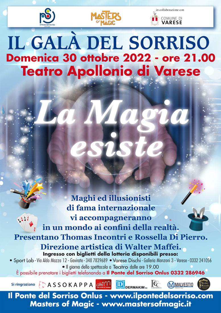 Illusionisti Italiani ed internazionali presenteranno incredibili e suggestive esibizioni di magia ai confini della realtà. Con la direzione artistica del grande Walter Maffei di Masters of Magic, il Galà della Magia è uno spettacolo imperdibile. L’ingresso è con biglietti della lotteria a 12 euro, da destinare a progetti per i bambini in ospedale, disponibili presso: Varese Dischi Galleria Manzoni Varese 0332-241056, Sport Lab via Aldo Mazza 12 Gavirate 348 7839689, il giorno dello spettacolo a Teatro dalle ore 19.00 oppure è possibile prenotarli telefonando a Il Ponte del Sorriso Onlus 0332-286946. Sostenere i nostri progetti significa scegliere il sorriso dei bambini in ospedale.