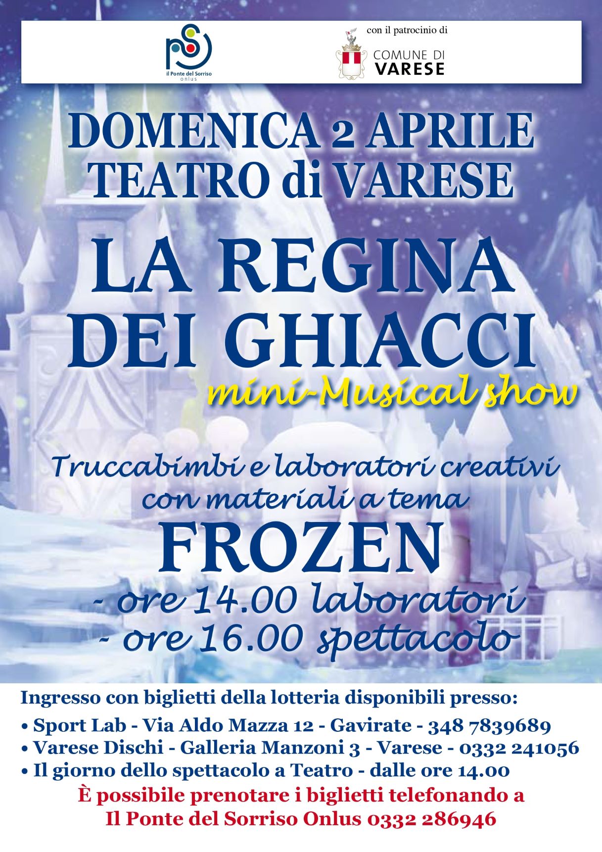 Domenica 2 aprile presso teatro di Varese. Alle 14.00 truccabimbi e laboratori creativi con materiale a tema Frozen, alle 16.00 spettacolo La Regina dei Ghiacci.