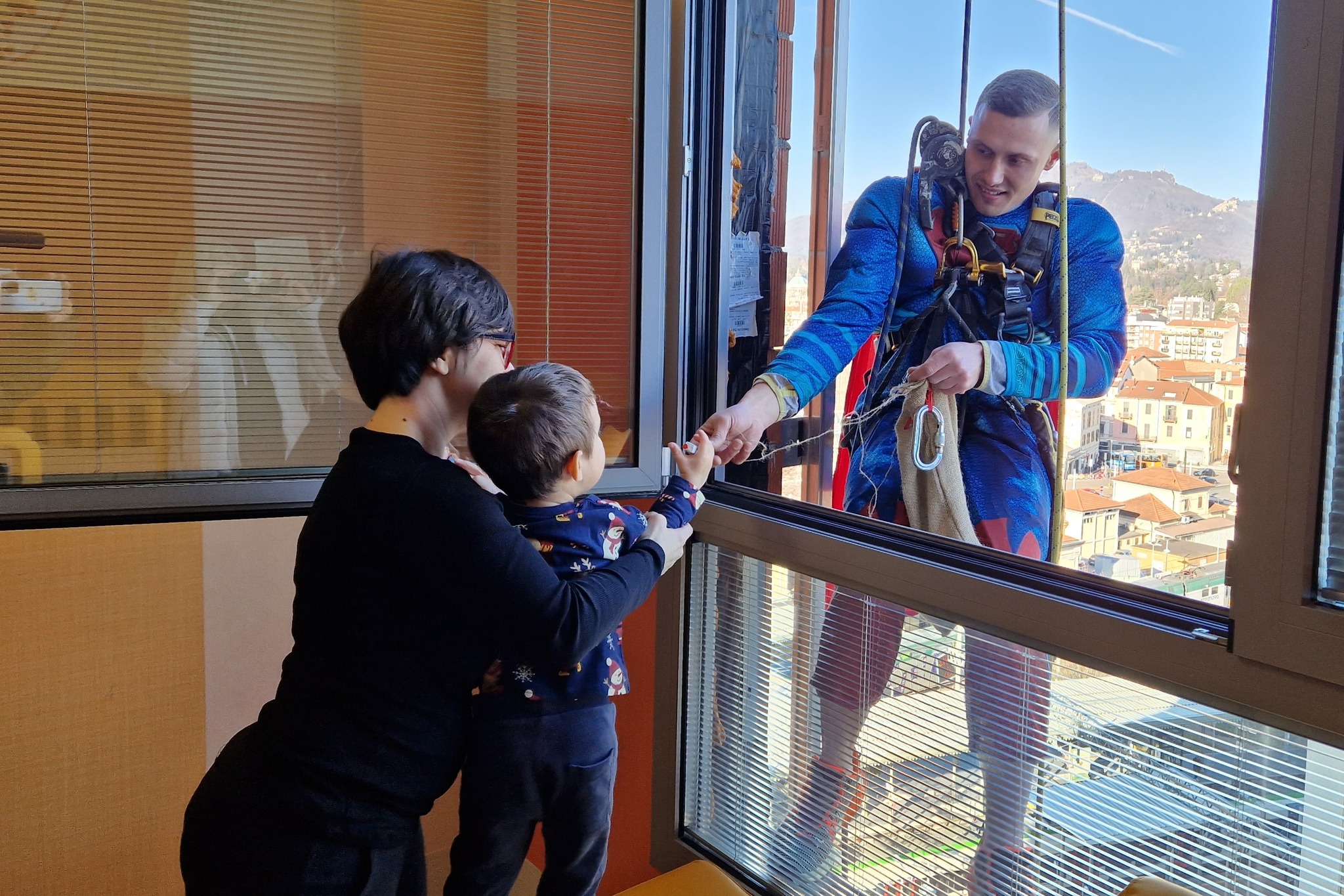 SUPEREROI ACROBATICI DAL TETTO. Occhi spalancati per lo stupore, gioia espressa battendo le mani, tanti sorrisi è tutto ciò che si è visto in Pediatria all’Ospedale Del Ponte al calarsi dei Supereroi dal tetto.