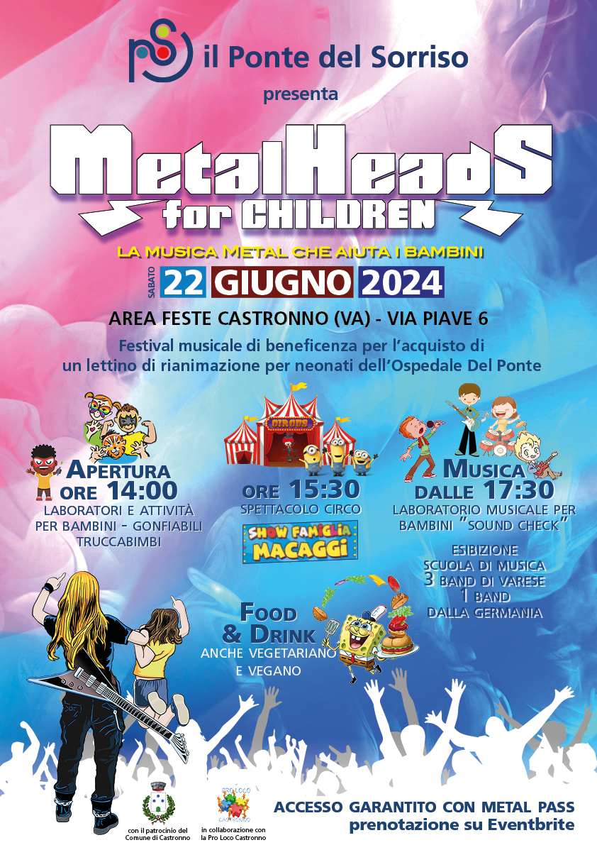 Laboratori creativi e musicali per sentirsi cantanti o batteristi per un giorno, gonfiabili, truccabimbi, spettacolo di circo, bolle giganti e in serata esibizione musicale con 4 band durante la quale si cena con panini e salamelle, patatine fritte, cibo vegano e vegetariano. Sabato 22 giugno all’area feste di Castronno, dalle ore 14.30, si terrà la prima edizione di Metal Heads, la musica metal che aiuta i bambini, con l’obiettivo di raccogliere fondi per acquistare un lettino di rianimazione per neonati da donare all’Ospedale Del Ponte. Vi aspettiamo super numerosi! Grazie.