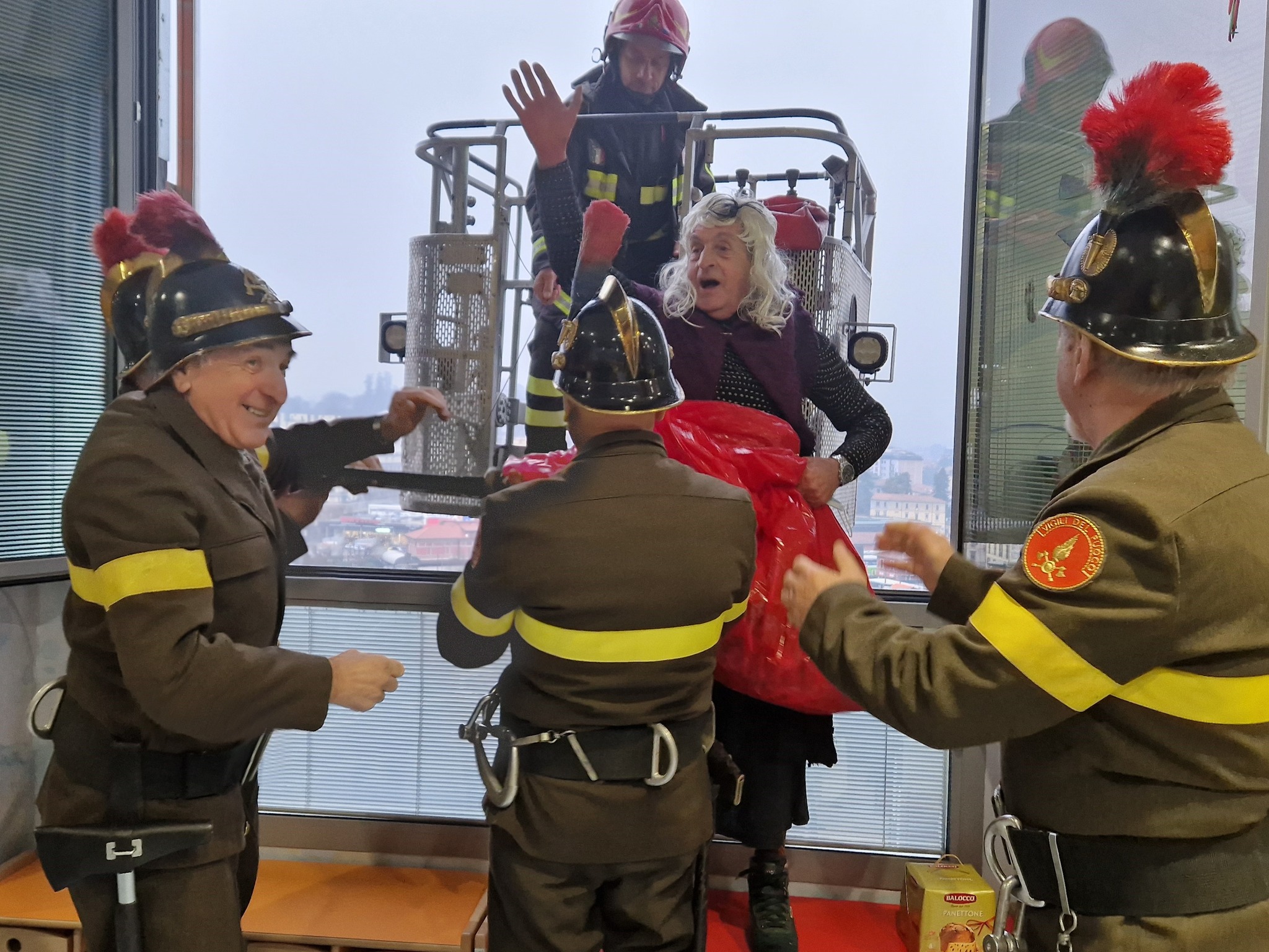 Immediatamente una squadra di pronto intervento si è attivata e con l’autoscala è stata portata fino al quinto piano, in sala giochi, dove ad attenderla c’erano tanti bambini preoccupati di non vederla arrivare.