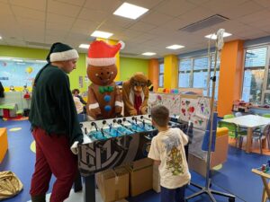 Una buffa compagnia che ha portato spirito natalizio e così tanta allegria che il piccolo Edoardo, in dimissione, non ha voluto andare a casa prima di aver sfidato e, naturalmente battuto, a calcetto Babbo Natale in persona.
