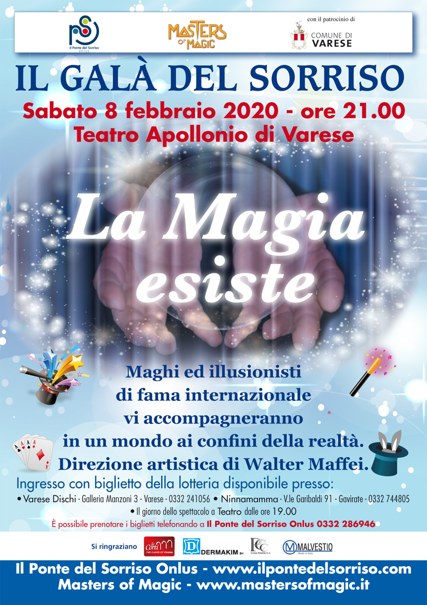 Illusionisti Italiani ed internazionali presenteranno incredibili e suggestive esibizioni di magia ai confini della realtà. Con la direzione artistica del grande Walter Maffei di Masters of Magic, il Galà della Magia è uno spettacolo imperdibile. L’ingresso è con biglietti della lotteria a 12 euro, da destinare a progetti per i bambini in ospedale, disponibili presso: Varese Dischi Galleria Manzoni Varese 0332-241056, Ninnamamma viale Garibaldi 91 Gavirate 0332-744805, il giorno dello spettacolo a Teatro dalle ore 19.00 oppure è possibile prenotarli telefonando a Il Ponte del Sorriso Onlus 0332-286946. Sostenere i nostri progetti significa scegliere il sorriso dei bambini in ospedale.