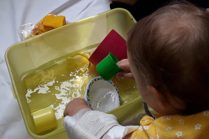 Che cosa si può fare con una bimba di 2 anni ricoverata, chiusa in camera, molto annoiata? Travasi con l’acqua! Abbiamo preparato tutto l’occorrente, un lenzuolo sotto e voilà, il gioco è pronto per rilassare la piccola e la mamma. Con fantasia ed entusiasmo aiutiamo ogni giorno i bambini a guarire giocando, anche in un periodo difficile come questo.