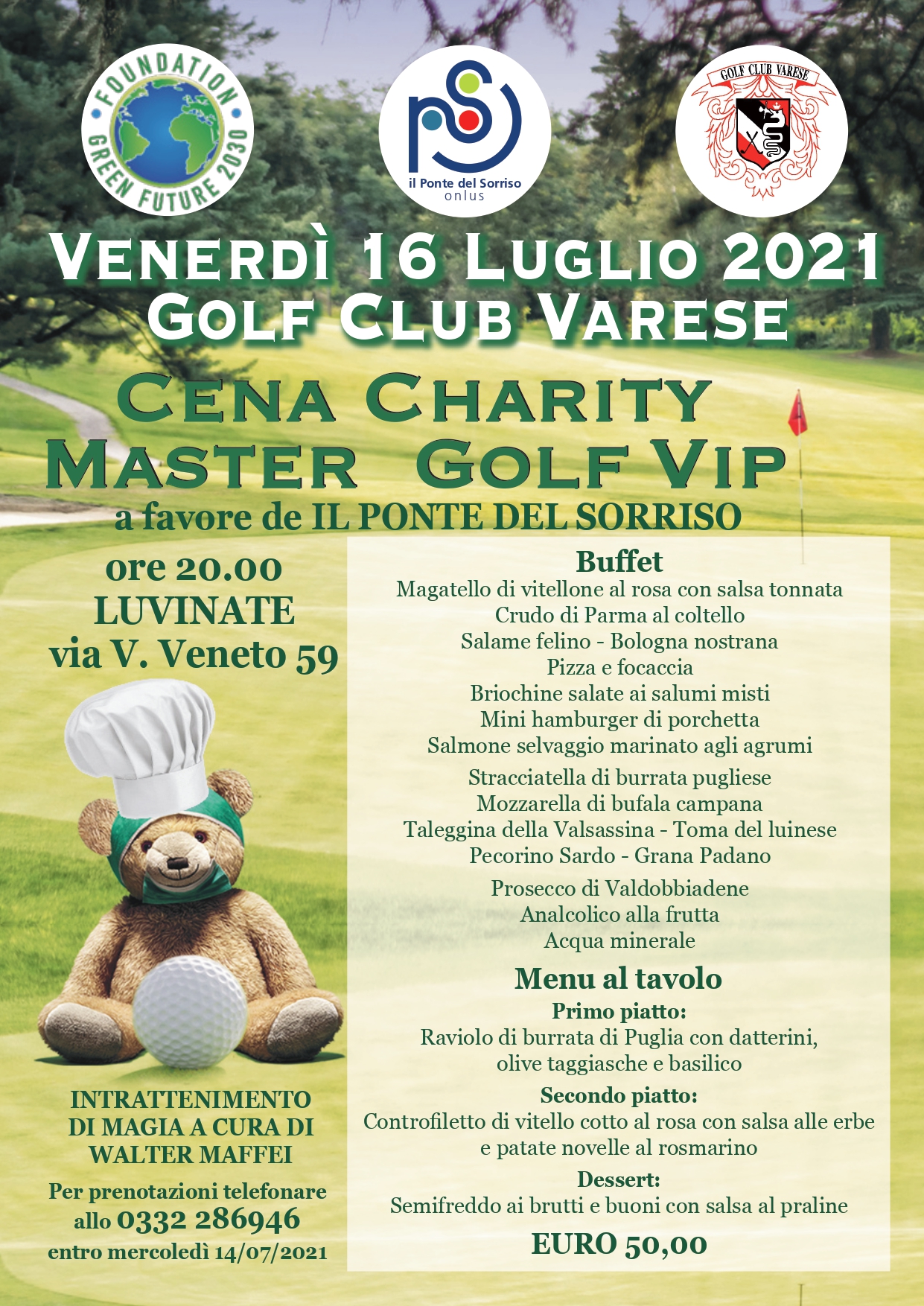 Nella splendida cornice del ristorante del Golf Club di Luvinate, Venerdì 16 Luglio alle ore 20.00, si terrà la cena di gala con vip e campioni di ieri e di oggi del mondo del calcio, dello spettacolo e del giornalismo che hanno partecipato al primo Charity Master Golf. Un menù ricco e gustoso per una serata resa ancora più speciale dalla magia di Walter Maffei. Il ricavato sarà interamente devoluto ai nostri progetti per i bambini in ospedale, non mancare! Prenotati allo 0332.286946!