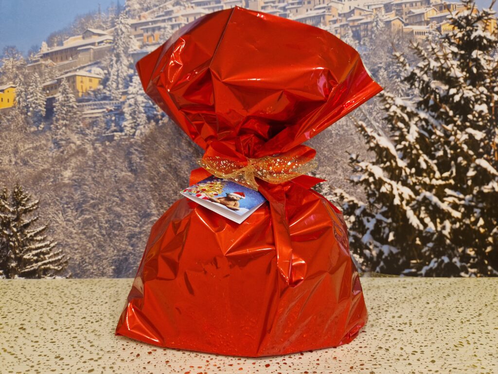 Panettone fresco di Pasticceria Milano da 750 grammi, confezione natalizia con un bigliettino natalizio personalizzato da Il Ponte del Sorriso, che può essere firmato da chi lo vuole regalare. Prenotabile nei gusti classico, cioccolato o pistacchio.