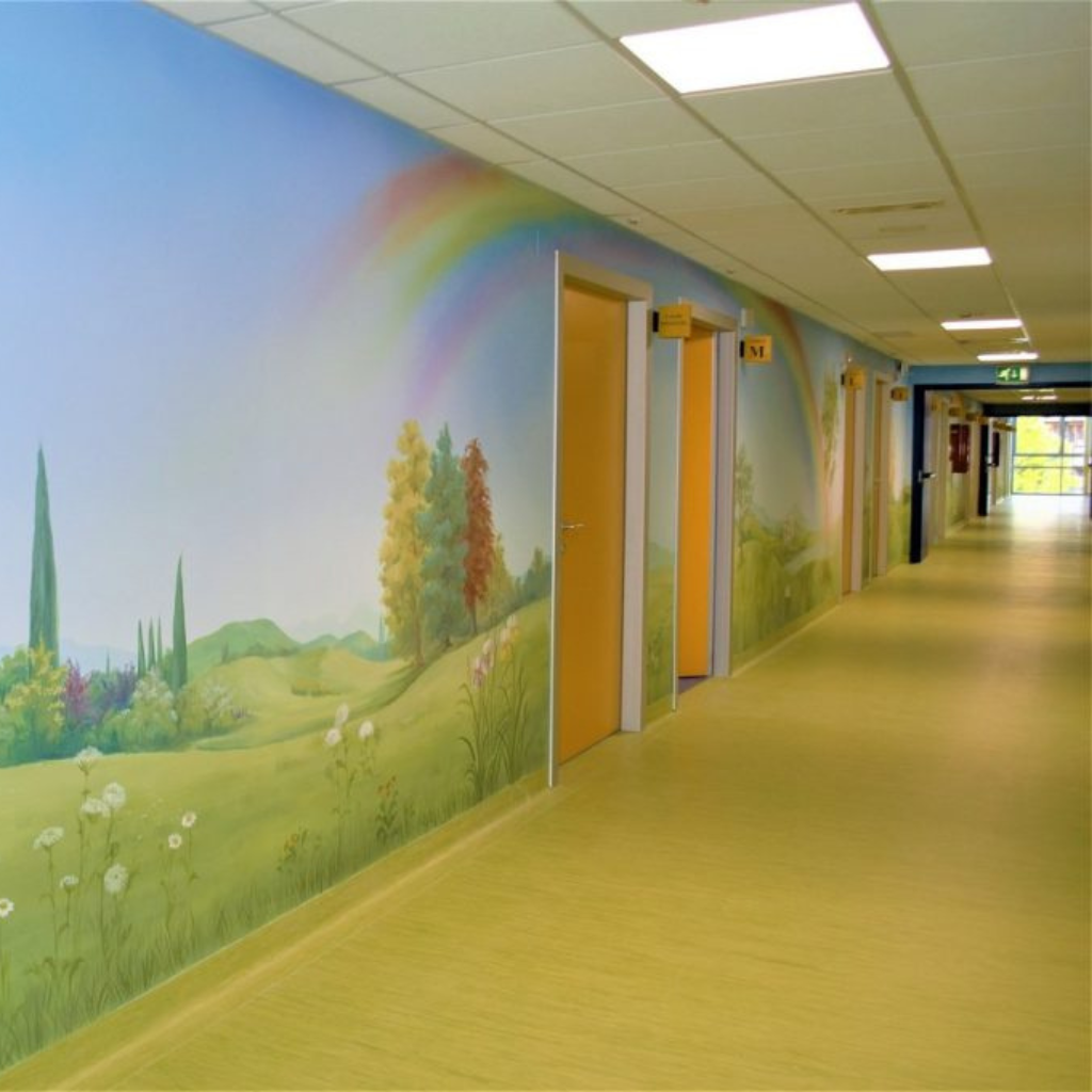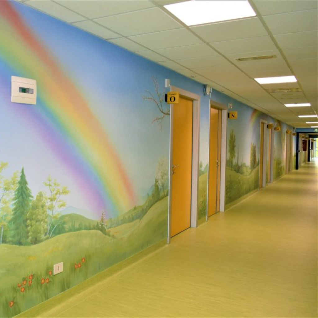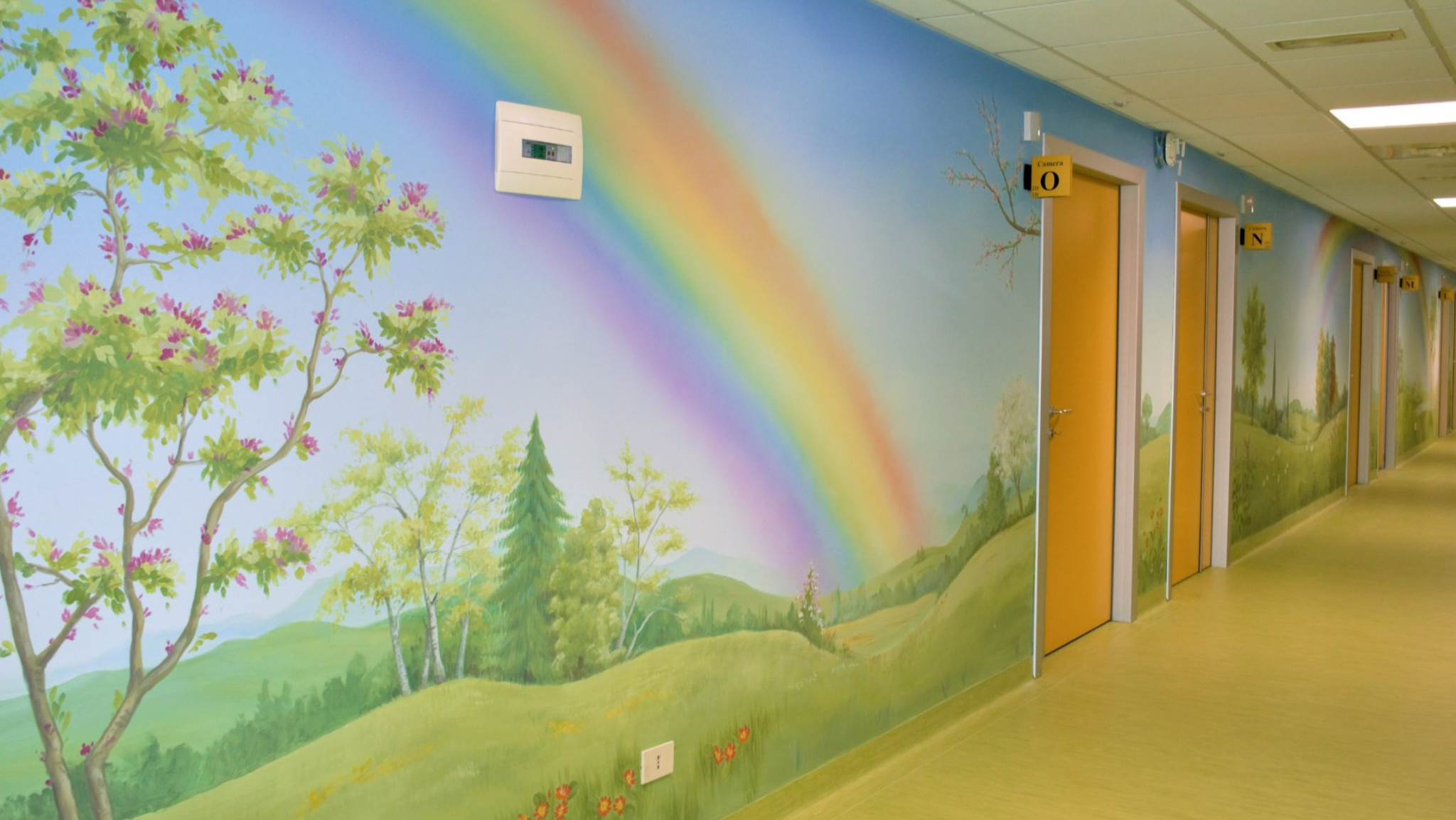 Portare arte, colore, fantasia, creatività in un ambiente solitamente asettico come un ospedale, è sempre una sfida. Figuriamoci in un’Ostetricia che non si considera mai di ambientare artisticamente, nonostante sia il primo luogo dove la mamma e il suo bimbo, si ri-incontrano, si vedono, si toccano, si sorridono, iniziano una relazione che durerà per sempre. Noi, invece, ci abbiamo pensato e per questo è un progetto unico. I reparti non sono tutti uguali e non curano le stesse patologie. Occorre quindi riflettere con attenzione sullo spazio in cui si va ad intervenire ed immaginare come renderlo accogliente e rassicurante, tenendo ben presente le emozioni e il benessere che le scelte cromatiche ed artistiche possono suscitare nelle persone ricoverate, mamme, neonati o bambini. In Ostetricia si respira l’inizio di una nuova vita. Per questo abbiamo pensato, quali soggetti del percorso artistico, alla primavera, che rappresenta la nascita, il risveglio, l’energia positiva, e all’arcobaleno, che esprime, tra i tanti significati, anche femminilità e fertilità, mentre in ogni stanza, dolcissimi cuccioli di ogni specie animale, invitano alla tenerezza e alle coccole. Un investimento di 600.000 euro, 420.000 da Asst dei Sette Laghi e 180.000 euro noi per trasformare radicalmente il reparto, dove noi abbiamo cambiato i pavimenti e le porte, rasato i muri delle camere e tinteggiati in modo allegro, ogni parete di un colore diverso nelle tonalità dell’arcobaleno, tutto reso cromaticamente armonioso. Grazie ai tanti donatori che credono in quello che facciamo., tra i quali anche i genitori di Federica, che era un’ostetrica del Del Ponte, da poco tra gli angeli. Ivana Malinverno e Giada Pisoni sono le due artiste che hanno curato le splendide decorazioni, cogliendo la suggestione dell’ambiente.