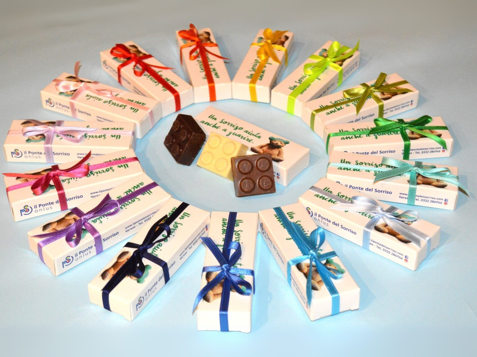 I mattoncini sono di cioccolato finissimo, prodotti dal maestro cioccolatiere Buosi, in esclusiva per le nostre bomboniere.