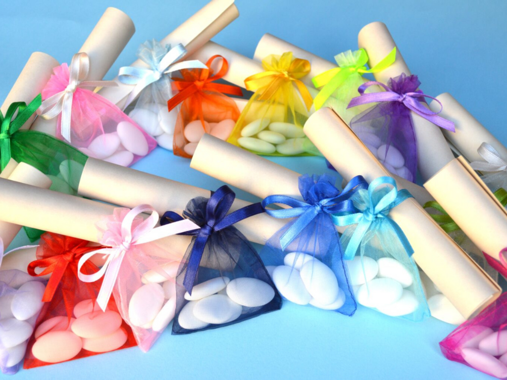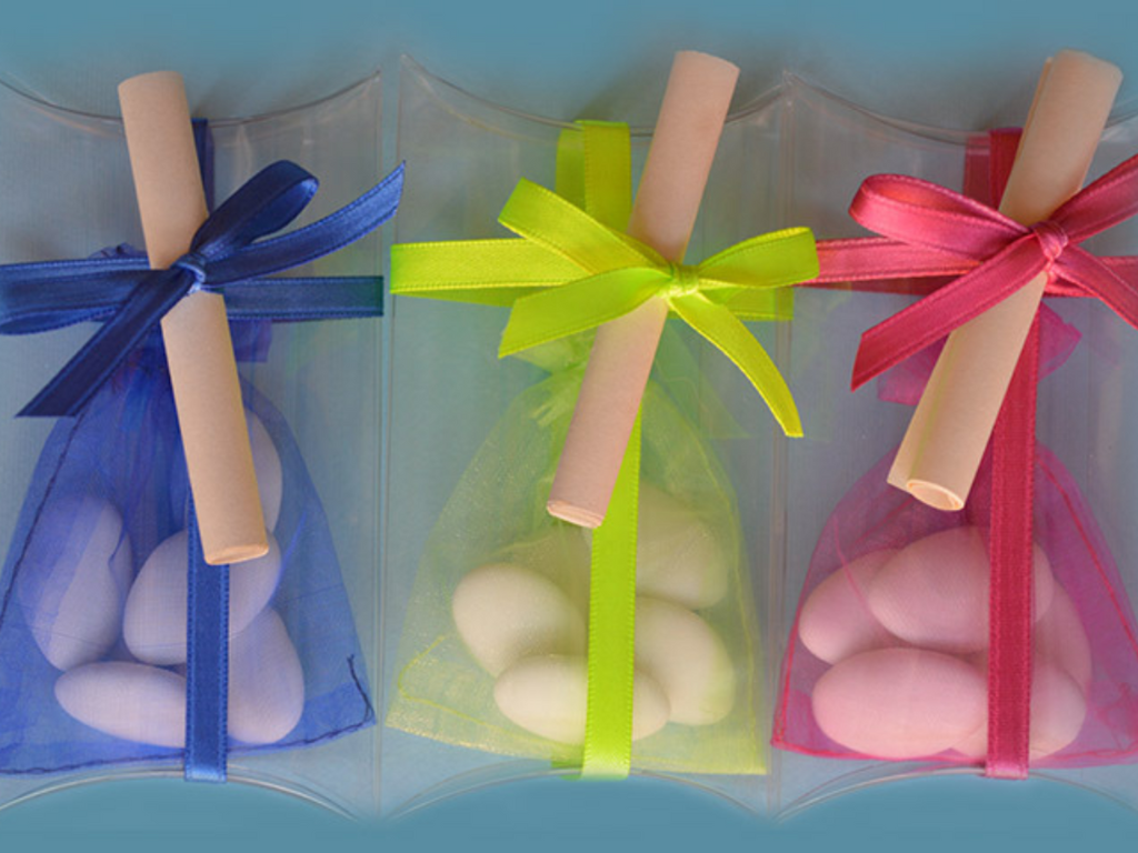I confetti sono disponibili alla mandorla o al cioccolato, contenuti in sacchettini, anch’essi di tanti colori da abbinare al nastrino secondo il proprio gusto.